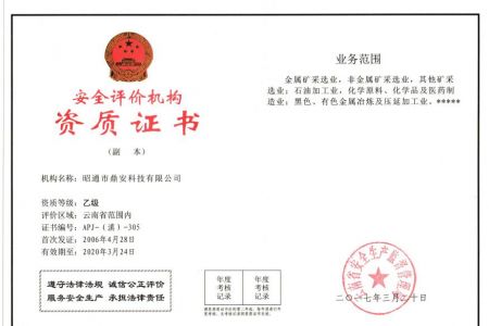 2003年11月10日,昭通市鼎安科技有限公司成立,初始主要從事第三方安全工程技術(shù)服務(wù),經(jīng)多年運(yùn)營,發(fā)展為多專業(yè)綜合科技平臺,為社會提供多種專業(yè)技術(shù)服務(wù)工作。 現(xiàn)公司注冊資金為1200萬元,公司法定代表人:毛衛(wèi)旭。公司主要業(yè)務(wù):安全評價、安全標(biāo)準(zhǔn)化評審、安全工程技術(shù)服務(wù);環(huán)境監(jiān)測、職業(yè)衛(wèi)生檢測、檢驗(yàn);法律訴訟及非訴訟服務(wù);司法鑒定、固定資產(chǎn)投資項(xiàng)目節(jié)能服務(wù);工程咨詢;工程測量測繪;安全教育培訓(xùn)等。是安全生產(chǎn)服務(wù)、安全教育培訓(xùn)機(jī)構(gòu),也是環(huán)境監(jiān)測和職業(yè)衛(wèi)生服務(wù)機(jī)構(gòu),同時也是綜合的檢測檢驗(yàn)、綜合科技平臺服務(wù)機(jī)構(gòu)。多年來為公、檢、法、司、軍、警、海關(guān)、仲裁、安監(jiān)、工礦商貿(mào)企業(yè)、社會團(tuán)體及個人提供多專業(yè)技術(shù)服務(wù)。